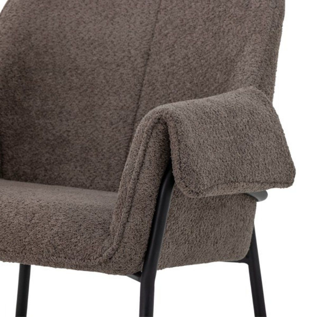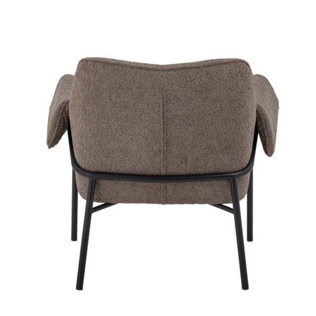 Fauteuil en tissu polyester brun avec pieds en métal noir.
