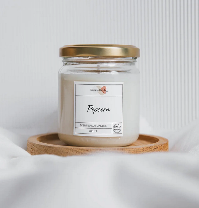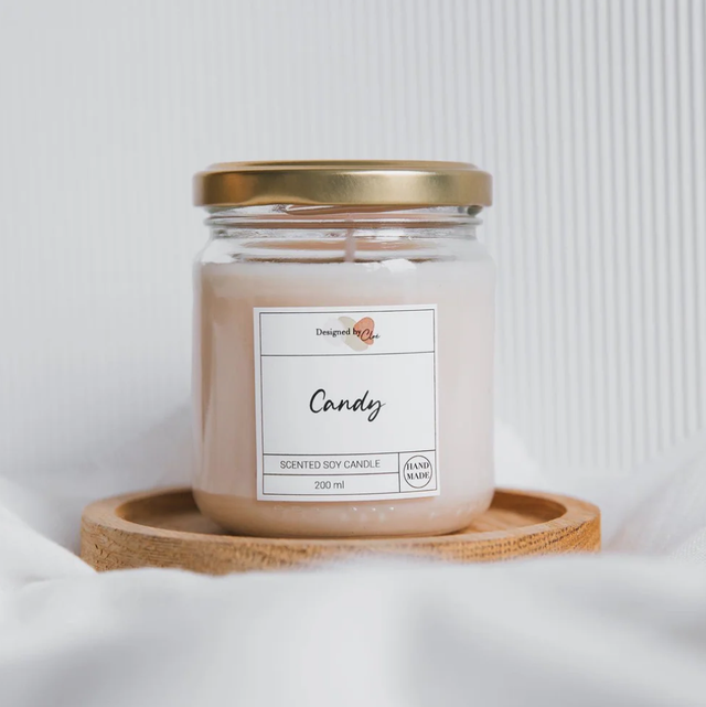 Bougie à la cire de soja parfumée dans un pot en verre avec couvercle en métal.